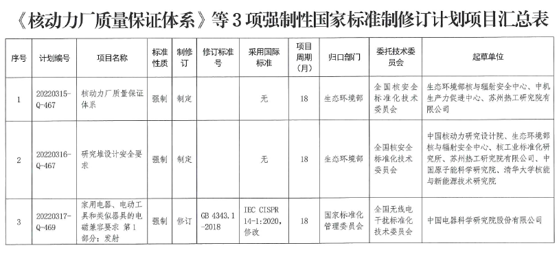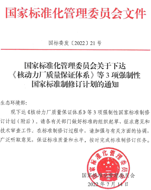 国家标准委下达《核动力厂质量保证体系》等3项强制性国家标准制修订计划