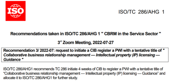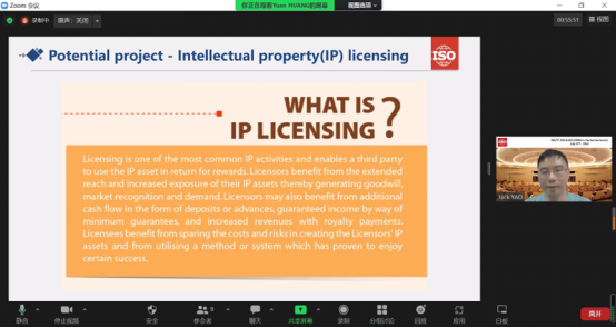 会议期间,姚歆对《合作关系管理 知识产权授权 指南》国际标准提案进行陈述,并接受国际专家的质询。与会专家经过讨论后表示该提案有助于丰富合作关系管理国际标准供给,将合作关系管理应用拓展到知识产权领域,也符合知识产权商业化运营的全球趋势。任务组同意该提案推动注册为国际标准预工作项目(PWI),这意味着中国将牵头制定“知识产权(IP)授权”领域的国际标准。