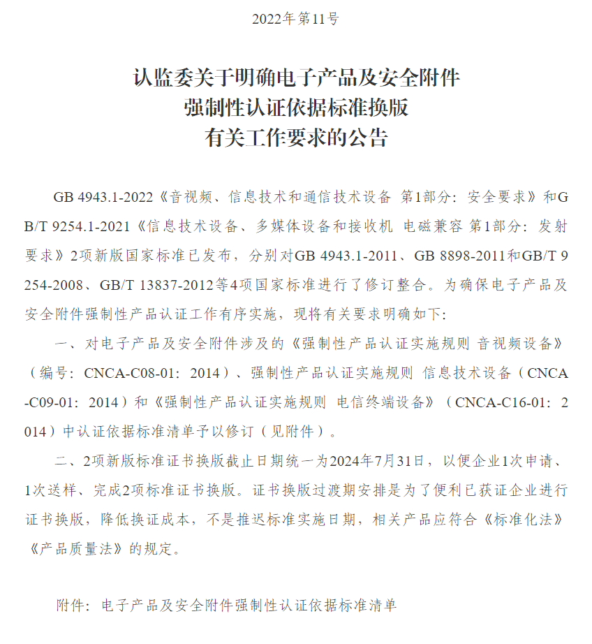 日前,《认监委关于明确电子产品及安全附件强制性认证依据标准换版有关工作要求的公告》正式发布。具体内容如下: