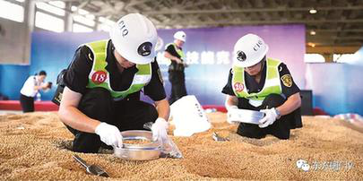 进境粮食检疫查验决赛设置在进境粮食查验现场。身着统一查验服装,配备“单兵作战装备”的选手冒着酷暑进入进境粮食模拟现场,按操作流程依次进行“登轮表层查验”“杂质检验与有害生物初筛”“有害生物检疫鉴定”等环节的技能比拼。 (许忠祥 摄)