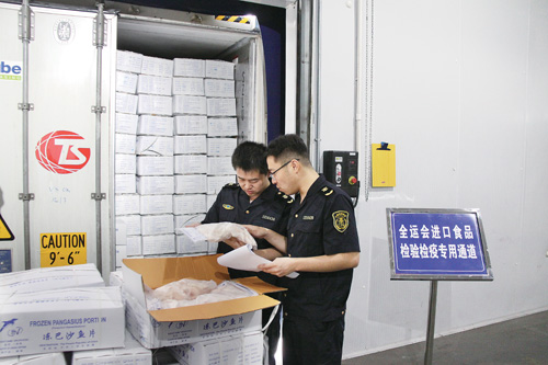 全运会前夕,32吨特供进口冷冻巴沙鱼片经天津局检验检疫合格,顺利入境,用于全运村的食品烹饪;由天津某猪肉产品出口企业供应的450头二分体猪肉经检测合格,顺利移交全运会组委会;同时,天津局组织技术力量开展了部分全运会用肉类食品的兴奋剂检测工作,整个全运会期间共计完成1200份猪肉产品和500份羊肉的4种兴奋剂共计6800项目次的检测任务……
