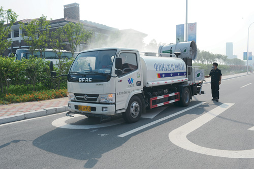 卫生技术人员对场馆周边绿化带进行卫生除害药物喷洒