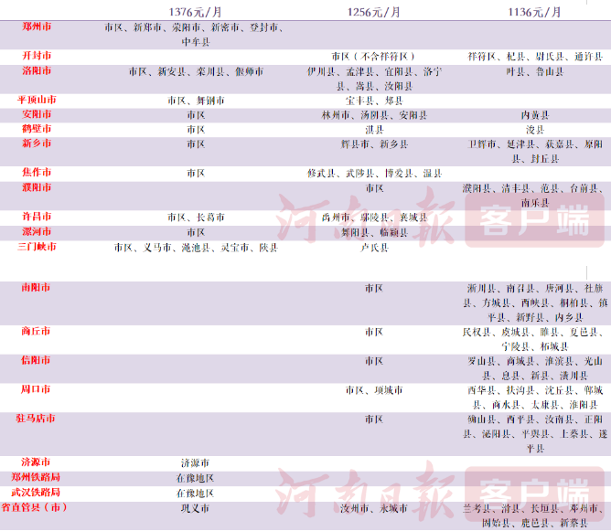 据介绍,失业保险金标准按照统筹地区失业保险经办机构所在地月最低工资标准的80%确定。我省一、二、三类行政区域月最低工资标准分别调整为1720元、1570元、1420元后,失业保险金标准相应调整为每月1376元、1256元、1136元。其中,实行市级统筹的省辖市(含市区及所属县市)原则上统一执行本市市区的失业保险金标准,具体标准由省辖市政府确定;纳入省直统筹的郑州铁路局、武汉铁路局在豫地区失业保险金标准,参照郑州市市区标准执行;省直管县(市)执行当地相应的失业保险金标准。
