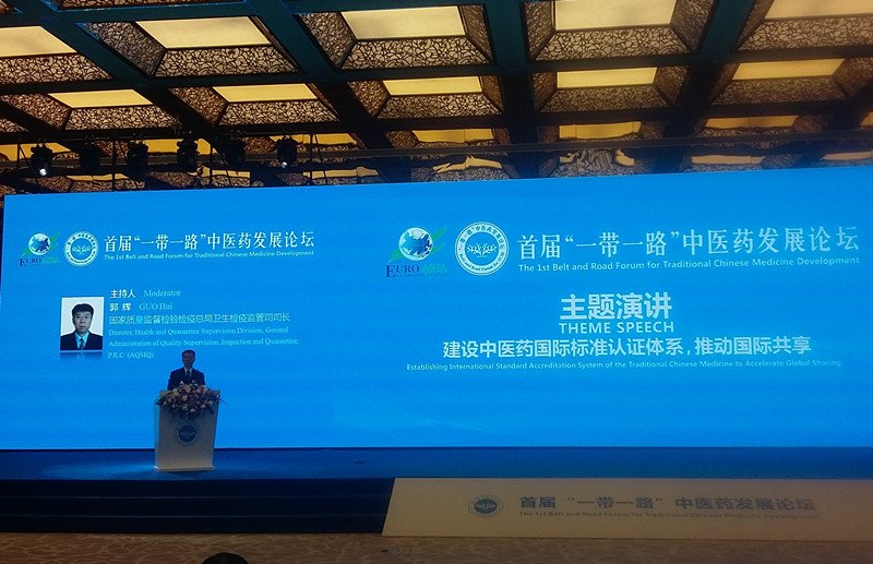 9月21日至22日,质检总局卫生司郭辉司长陪同总局陈钢副局长参加2017年欧亚经济论坛,并在首届“一带一路”中医药发展论坛开幕式上主持主题为“建设中医药国际标准认证体系,推动国际共享”的主旨演讲。