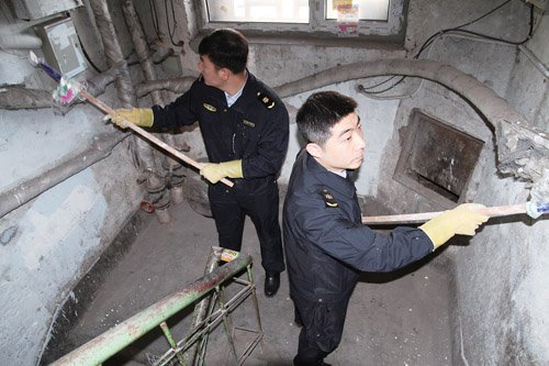 学雷锋志愿者服务队深入社区开展志愿服务,清理居民楼内非法广告。 冉濡圻 摄