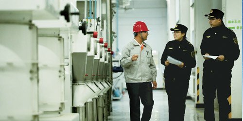 检验检疫工作人员在中粮米业(吉林)有限公司大米加工车间进行技术指导和过程监督 张 靖 摄