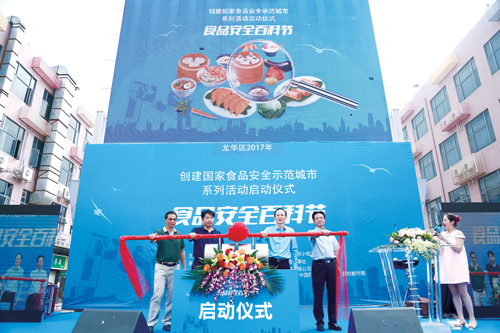 2017年5月14日,龙华区在大浪商业中心成功举办2017年创建国家食品安全示范城市系列活动启动仪式暨食品安全百科节活动。龙华区副区长陈建民(右二),深圳市市创建办、市食药局食品药品安全总监单友亮(左二),市市场和质量监管委龙华局局长郑镜雄(右一)和大浪街道办副调研员游植煌(左一)共同上台推动食品安全加速器,宣布龙华区2017年创建国家食品安全示范城市系列活动正式拉开序幕。