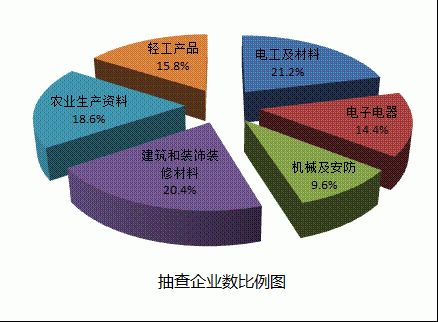 一是轻工产品类抽查了323家企业生产的332批次产品,包括家用卫生杀虫用品、自行车、树脂镜片、电动自行车、家用燃气灶5种产品,不合格产品检出率为12%;二是电工及材料类抽查了430家企业生产的430批次产品,包括稀土氧化物、钢丝绳、阀门、砂轮及动力用煤5种产品,不合格产品检出率为10.5%;三是电子电器类抽查了292家企业生产的292批次产品,包括房间空气调节器、集成电路(IC)卡读写机、食具消毒柜、储水式电热水器、热泵热水机(器)、电磁灶、家用电动洗衣机7种产品,不合格产品检出率为19.9%;四是机械及安防类抽查了196家企业生产的196批次产品,包括磨床、防爆电气、容积式空气压缩机、锁具4种产品,不合格产品检出率为11.2%;五是建筑和装饰装修材料类抽查了414家企业生产的414批次产品,包括机织地毯、防水涂料、浸渍胶膜纸饰面人造板、实木地板、溶剂型木器涂料、浸渍纸层压木质地板6种产品,不合格产品检出率为5.6%;六是农业生产资料类抽查了377家企业生产的377批次产品,包括稻麦联合收割机、磷肥、植物保护机械、农药4种产品,不合格产品检出率为3.7%。