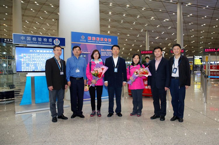 10月21日下午5点29分,由广东检验检疫局技术中心师永霞和安徽检验检疫局保健中心吴瑕组成的质检总局首批派驻安哥拉传染病监测哨点防疫工作组,经过一个月紧张艰苦的工作,圆满完成各项任务,顺利抵达北京首都机场。卫生司郭辉司长、宋悦谦副司长一行赴首都机场迎接。