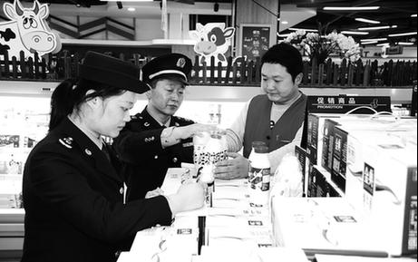 图为该局执法人员在超市抽检酸奶产品的标签标识。 张 雷 仰 虎 摄