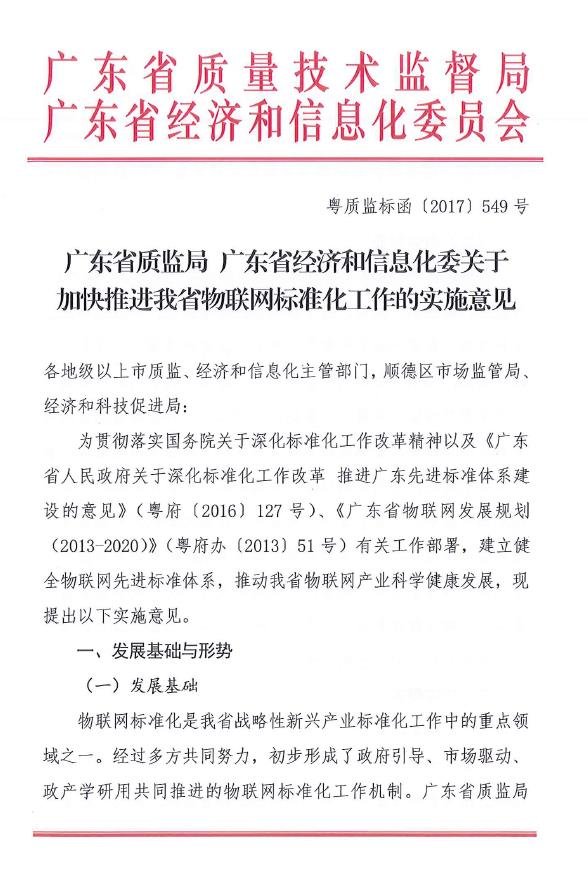 为促进我省物联网产业先进标准化体系建设,广州市标准化研究院信息检测中心起草了《关于加快推进我省物联网标准化工作的实施意见》,近日,由广东省质量技术监督局和广东省经济和信息化委员联合正式发布。该意见规划了物联网标准化的顶层设计和布局,进一步深化对发展物联网重要意义的认识,有助于推进物联网产业先进标准体系及应用,推动广州市标准化研究院物联网标准化工作又上新台阶。