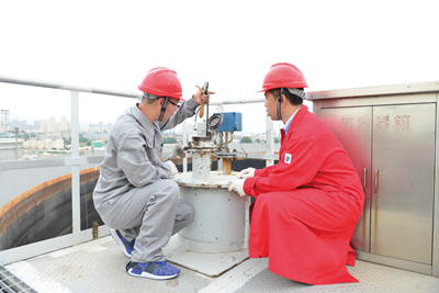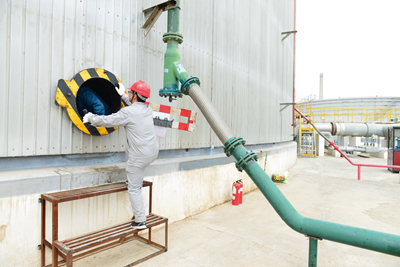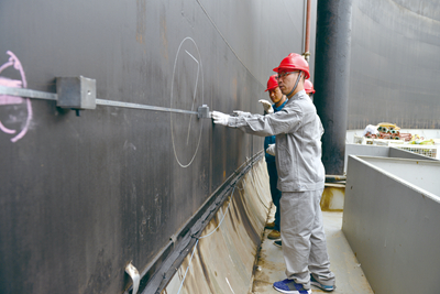 履行完进入库区的相关手续,并登记签字后,杨盼和孙晓鹏手提50多公斤的检测设备走到18号油库,从罐底部的人孔口钻进了黑魆魆的油库内,开始做检测前的准备工作。刚一进去,安全帽上和衣服上就蹭上了黑乎乎的油泥,一股股刺鼻的气味直呛得人难受……刘苏荣则从罐体外人梯爬上罐顶,因为有风,30米高的栏杆显得有点摇晃。兰州作业区主管计量的副主任丁长涛站在下面不住地提醒:“抓紧栏杆,抓好栏杆!”