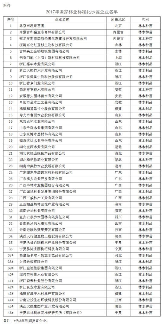 两部门关于公布2017年国家林业标准化示范企业的通知
