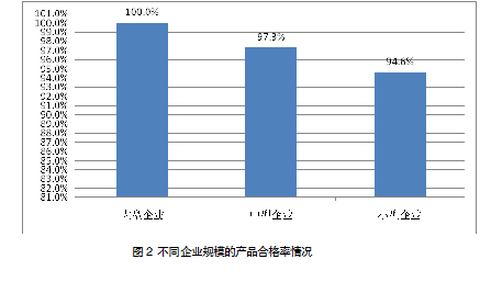 从抽查的企业规模上来看,大型企业抽查到38家,产品质量合格率100%;中型企业抽查到111家,产品质量合格率为97.3%;小型企业抽查到716家,产品质量合格率为94.6%。不同企业规模的产品合格率情况见下图: