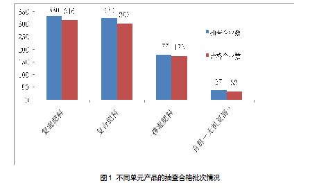 从抽查的产品单元上来看,抽查复混肥料样品330批次,合格316批次,合格率95.8%;抽查掺混肥料样品177批次,合格173批次,合格率97.7%;抽查标称复合肥料样品322批次,合格302批次,合格率93.8%;抽查有机-无机复混肥料样品37批次,合格33批次,合格率89.2%。不同单元产品的抽查合格批次情况见下图: