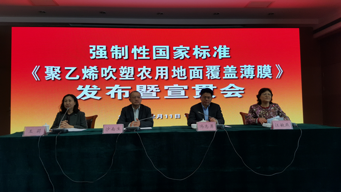 2017年12月11日,工业和信息化部、国家标准委、农业部在北京联合召开强制性国家标准《聚乙烯吹塑农用地面覆盖薄膜》(简称《农用地膜》)发布暨宣贯会,相关行业协会和标准化专业技术委员会、国内主要地膜生产企业、有关地方政府和地方农业环保站、检验检测机构等单位160余人参加会议。工业和信息化部科技司副司长沙南生、消费品工业司副巡视员汪敏燕,国家标准委工业标准二部副主任王莉和农业部科技教育司副司长冯志勇出席会议并讲话。