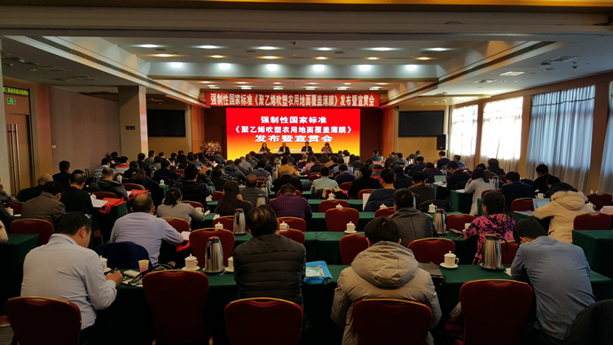 2017年12月11日,工业和信息化部、国家标准委、农业部在北京联合召开强制性国家标准《聚乙烯吹塑农用地面覆盖薄膜》(简称《农用地膜》)发布暨宣贯会,相关行业协会和标准化专业技术委员会、国内主要地膜生产企业、有关地方政府和地方农业环保站、检验检测机构等单位160余人参加会议。工业和信息化部科技司副司长沙南生、消费品工业司副巡视员汪敏燕,国家标准委工业标准二部副主任王莉和农业部科技教育司副司长冯志勇出席会议并讲话。
