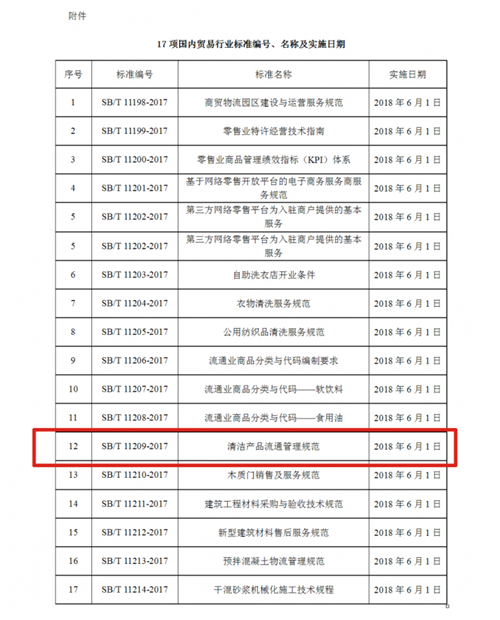 据国家商务部网站公告,商务部批准《清洁产品流通管理规范》等17项国内贸易行业标准并予以公告,标准于2017年8月28日正式公告,标准号:SB/T11209-2017,实施日期为2018年6月1日。