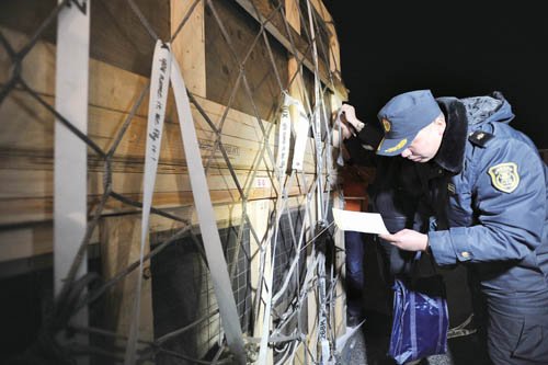 2月10日凌晨,在北京首都国际机场BGS货运站,检验检疫人员查看运单。当日凌晨,第二批115只来自荷兰的活体驯鹿经空运抵达北京首都国际机场,并顺利通过海关、检疫手续,准备前往内蒙古自治区根河林业局的新家。为延续当地敖鲁古雅驯鹿文化、带动驯鹿相关产业,内蒙古根河林业局委托贸易公司,从荷兰分批次进口了活体驯鹿。李任滋 摄