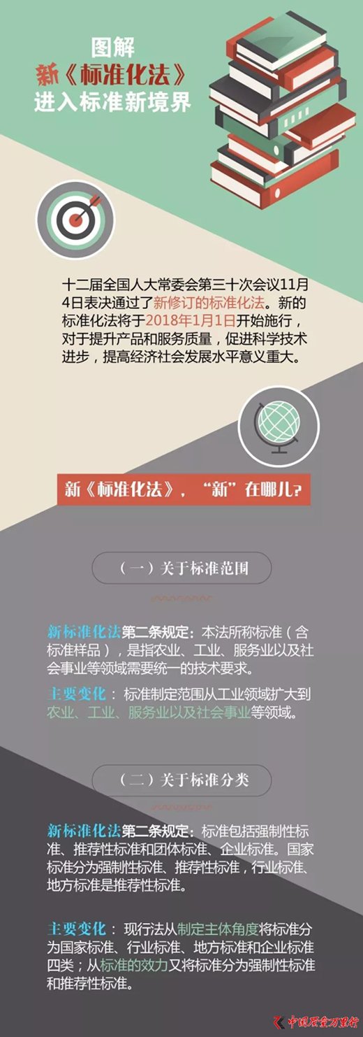 十二届全国人大常委会第三十次会议11月4日表决通过了新修订的《标准化法》。新修订的《标准化法》将于2018年1月1日开始施行,对于提升产品和服务质量,促进科学技术进步,提高经济社会发展水平意义重大。《中华人民共和国标准化法》颁布于1988年,已施行近30年。新修订的《标准化法》对标准的制定、实施和监督管理作了全方位、全过程的规定。国家标准分为强制性标准、推荐性标准,行业标准、地方标准是推荐性标准。强制性标准必须执行。国家鼓励采用推荐性标准。