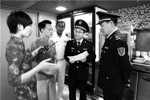 今年以来,海口秀英港开通了多条涉外邮轮旅游航线,乘坐邮轮出游成了旅客的新时尚。海南检验检疫局海口地区办事处完善工作机制,创新检疫监管模式,根据风险评估对部分邮轮实施电讯检疫,大大提高了邮轮入境的通关速度,有力地促进了海南邮轮经济发展。图为海口地区办事处工作人员在对入境邮轮实施检疫查验。 本报记者 符传涛 摄