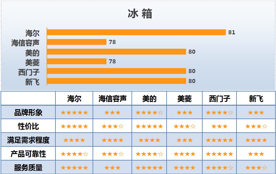 冰箱行业的6个主要品牌中,知名度较高的是海尔、西门子和新飞,分别为67分、66分和65分;海信容声、美菱和美的分别为61分、61分和59分。美誉度较高的是海尔和西门子,均为83分;海信容声和新飞次之,均为82分;美菱和美的分别为78和68分。