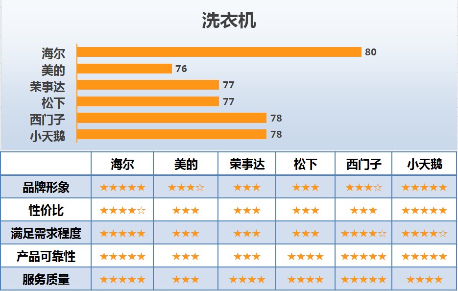 洗衣机行业的6个主要品牌中,知名度较高的是海尔,74分;其次是小天鹅和西门子,分别为71分和68分;荣事达、松下和美的得分分别为65分、63分和58分。美誉度较高的是海尔,为88分;荣事达和松下次之,均为87分;西门子紧随其后,83分;美的和小天鹅分别为78和73分。