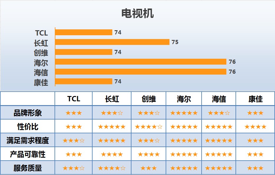 电视机行业6个主要品牌的调查结果如图5所示。其中,海信和海尔品牌得分最高,均为76分,其次是长虹,为75分。从调查的主要指标来看,海信和海尔在性价比、产品可靠性以及服务质量方面优势明显;海尔在品牌形象方面表现最好;长虹在性价比和满足需求程度方面均获得消费者较高评价。