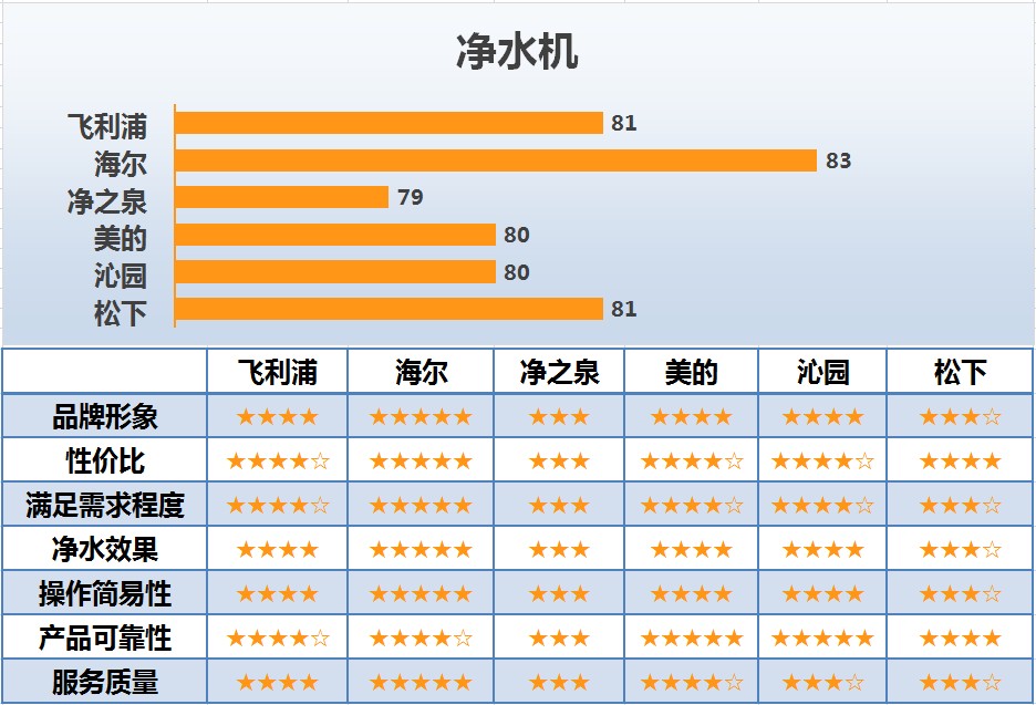 净水机行业的6个主要品牌中,知名度最高的是海尔,91分;飞利浦和美的次之,均为90分;沁园紧随其后,为86分;松下和净之泉分别为73分和59分。美誉度最高的是海尔,76分,美的和沁园次之,为75分,随后是飞利浦、松下和净之泉,分别为73分、72分和71分。