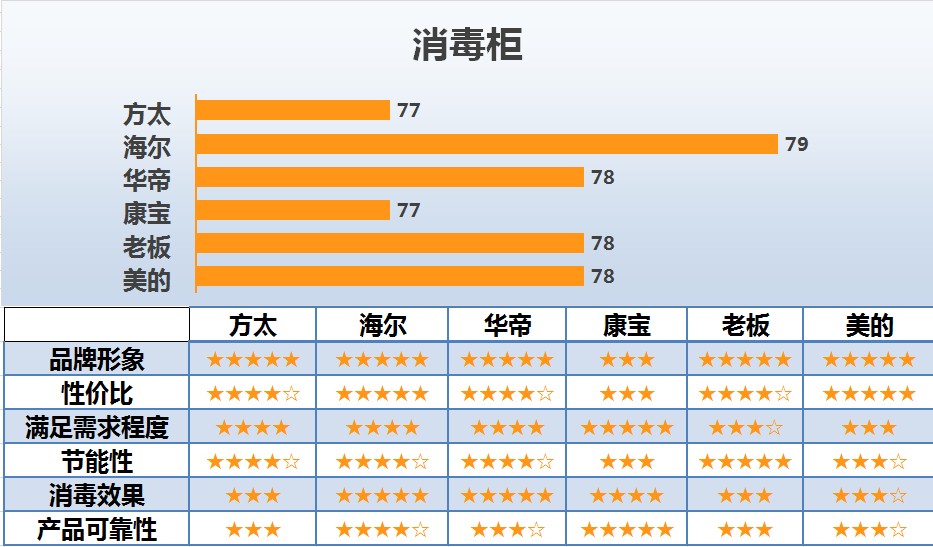 消毒柜行业的6个主要品牌中,知名度最高的是方太,92分;美的次之,为91分,随后是老板和康宝,分别为88分和81分,最后是华帝和海尔,为74分和67分。美誉度得分最高的是华帝,80分;海尔次之,为79分;随后是老板、美的、方太,分别为78分、76分、75分,康宝为67分。