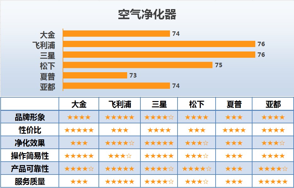 空气净化器行业6个主要品牌的调查结果如图12所示。其中,飞利浦和三星品牌得分最高,为76分,其次是松下,为75分。从调查的主要指标来看,飞利浦在品牌形象和产品可靠性方面的优势较为明显;大金的性价比最高;三星在净化效果方面表现最好;亚都在服务质量方面获得消费者较高评价。