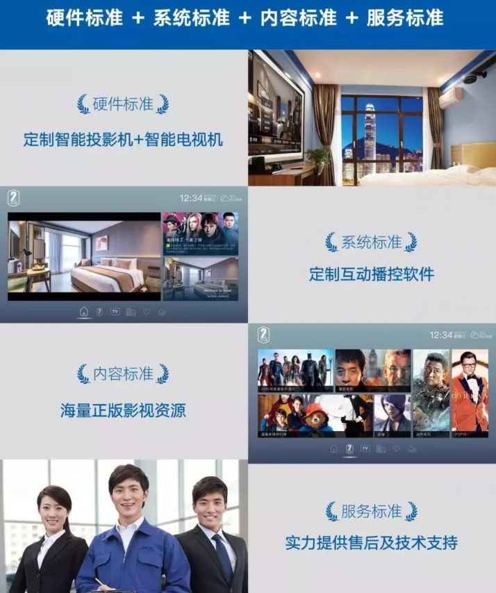 按酒店环境及特色定制的人性化操作系统,可植入专属品牌TVC与欢迎界面,统一展示品牌形象;快捷接入酒店PMS/RCU/TV交互服务系统,可对接旅游、购物平台,吸引用户提升酒店收益 内容标准:正版授权 与正版内容平台签约点播协议,合法合规,累积数万部影视资源,给住客更好的观影选择,并配备资源专员运营,热门资源实时更新;可根据酒店实际情况选择云端或是本地服务器观影,优化观影体验。