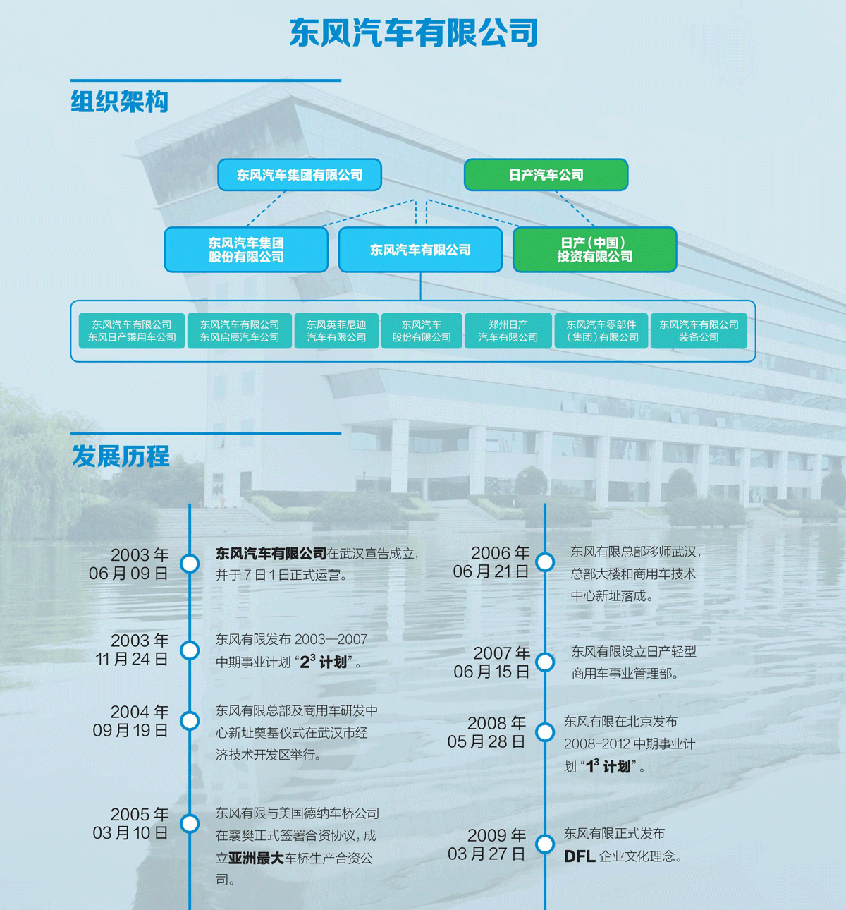 2003 年6 月9 日,由东风汽车集团有限公司与日产汽车公司战略合作携手组建的中国首家拥有全系列乘用车及轻型商用车产品的汽车合资企业——东风汽车有限公司(以下简称“东风有限”)成立,并于2003年7 月1 日正式运营。