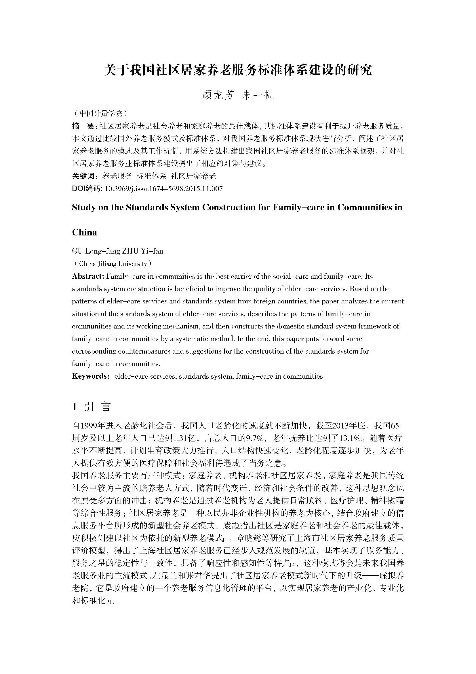关于我国社区居家养老服务标准体系建设的研究